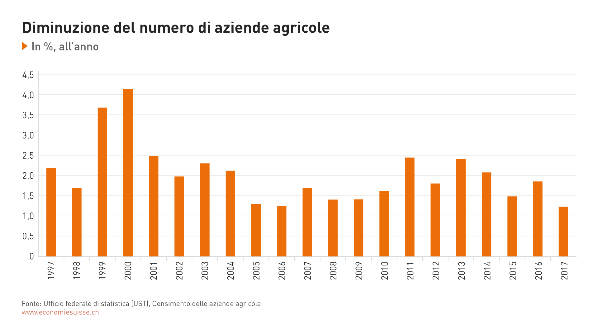 Dopo il 1985 il numero di aziende agricole di è quasi dimezzato. La diminuzione è stata particolarmente sensibile alla svolta del millennio (cf. grafico 4) prima di stabilizzarsi nuovamente. Nel 2017, l’1,2% delle aziende agricole ha cessato l’attività. Questo concerne essenzialmente le piccole e medie strutture, poiché il numero di aziende di oltre 30 ettari è cresciuto in quell’anno.